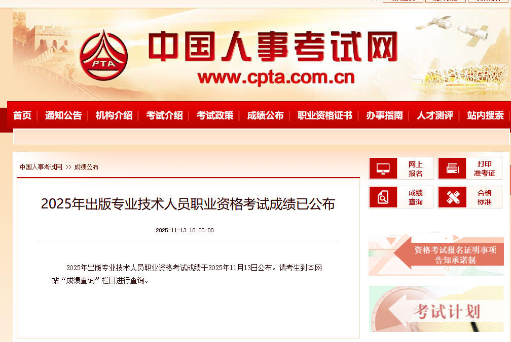 2025年出版专业资格考试成绩已于11月13日公布。通过中国人事考试网(www.cpta.com.cn)查询成绩。